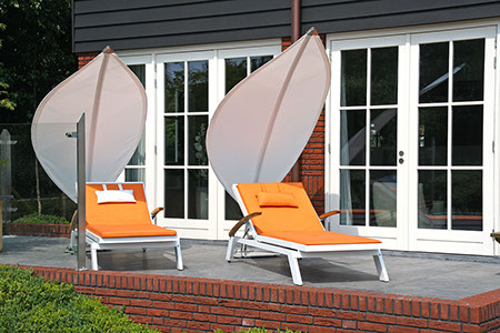 Diese beiden Liegen werden von jeweils einem UMBROSA Rimbou Lotus umrahmt. Mit der Bodenplatte aus Stahl und dem schwenkbaren Gelenk ist der Rimbou der perfekte Begleiter jeder Sonnenliege.