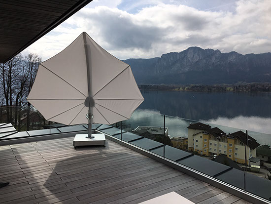 Das Top-moderne Penthouse mit Seeblick und Bergpanorama sucht die Sonne, und benötigte auch Schatten. Der variable Schirm Spektra von Umbrosa bietet auch bei niedrigem Sonnenstand perfekten Schutz. Das Design ist darüberhinaus etwas Besonderes.