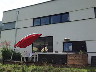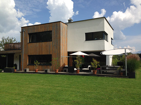 Bei moderner Architektur kann man gerne mit Formen und Kontrasten spielen. Bei diesem modernen Einfamilienhaus wurde der sehr klare Baukörper mit vielen großen Glasflächen mit der runden Form des Umbrosa Eclipsum in Kontrast gesetzt.