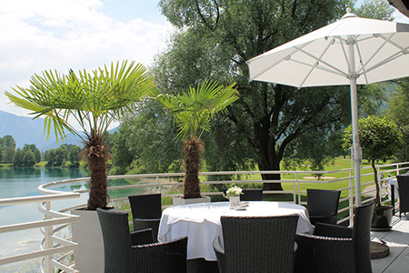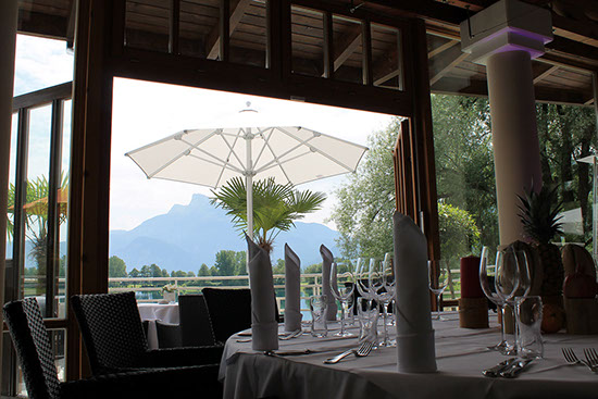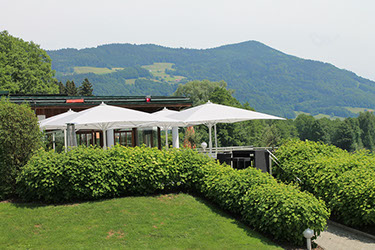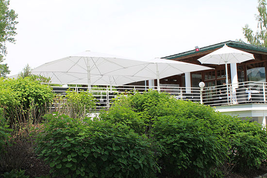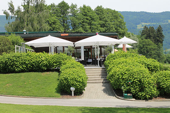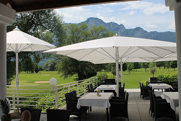 Der Golfclub am Mondsee ist ein herrliches Refugium für jeden Golfspieler, aber auch für alle Geniesser großer Gaumenfreuden. Die Empfangsterrasse mit dem schönen Blick auf Tee 1 lockt in den Schatten des Umbrosa Spectra.