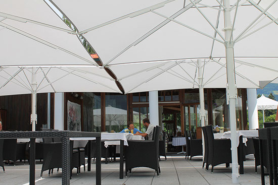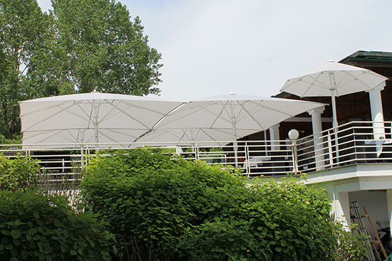 Darüber hinaus wurden auch die Umbrosa Schirme Ikarus, das Blatt, und der Paraflex mit Wandmontage installiert. Sie ergänzen die klaren Garten Möbel von Jan Kurtz.